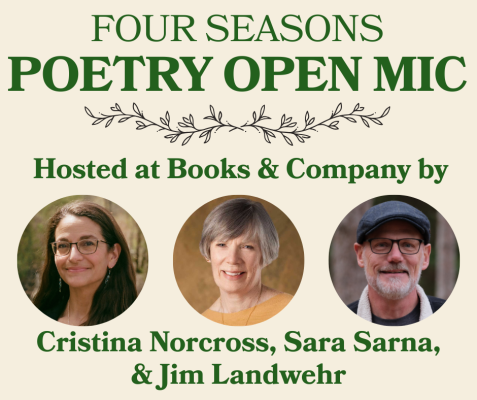 Come join us for an evening of poetry and connection at Books & Company on Saturday, September 27th from 6:30-8pm for our inaugural event! All are welcome. 2 poem max per poet + bring an extra poem, in case we have time for a second round. (Note: May include a content with potentially triggering material.) Optional theme for fall: HARVEST (or bring any poems you’ve been working on).